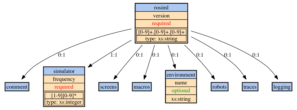 <rosiml version="0.8.40"> <simulator> ... </simulator> <screens> ... </screens> <macros> ... </macros> <environment> ... </environment> <robots> ... </robots> <traces> ... </traces> <logging> ... </logging> </rosiml> |